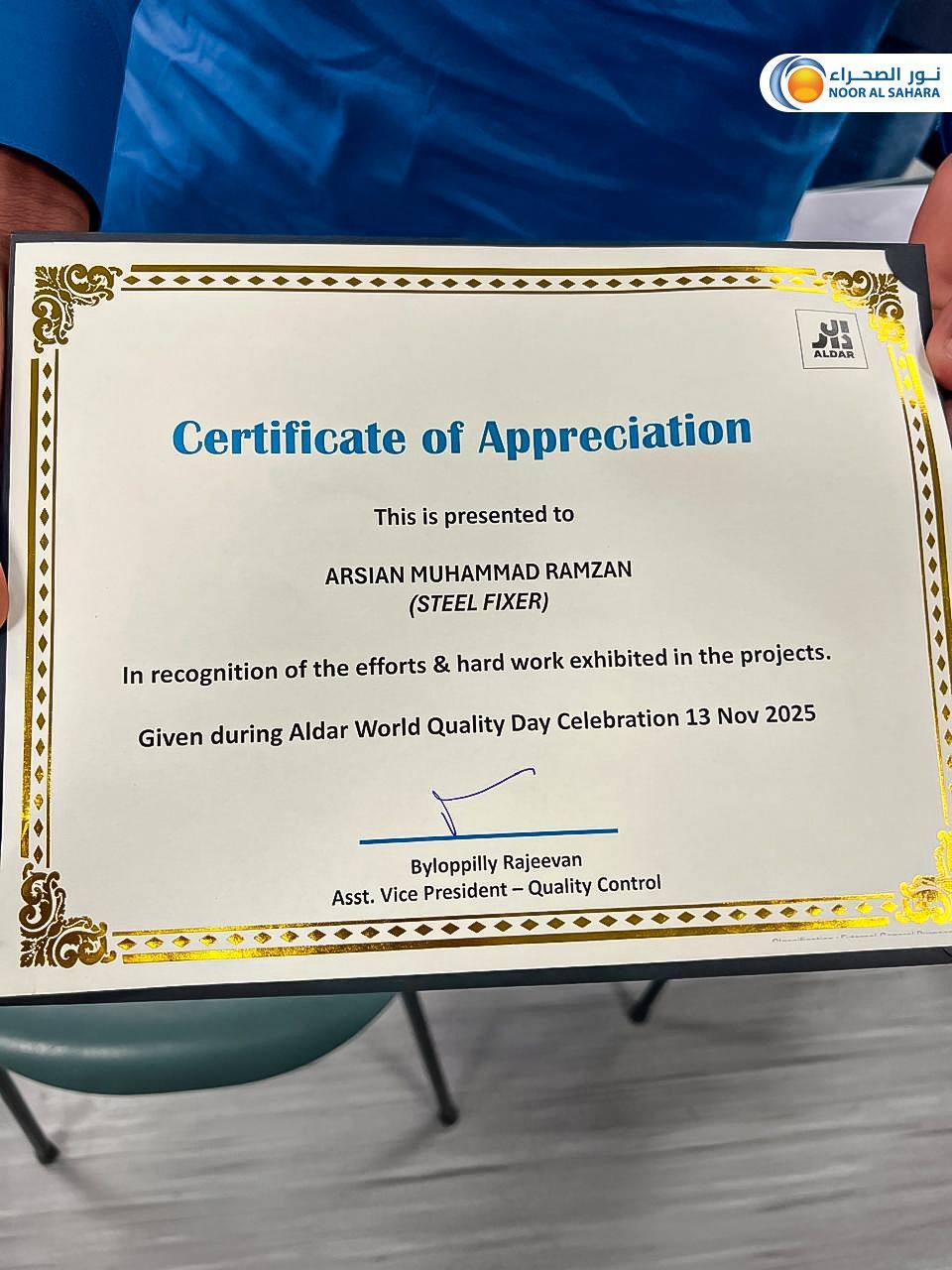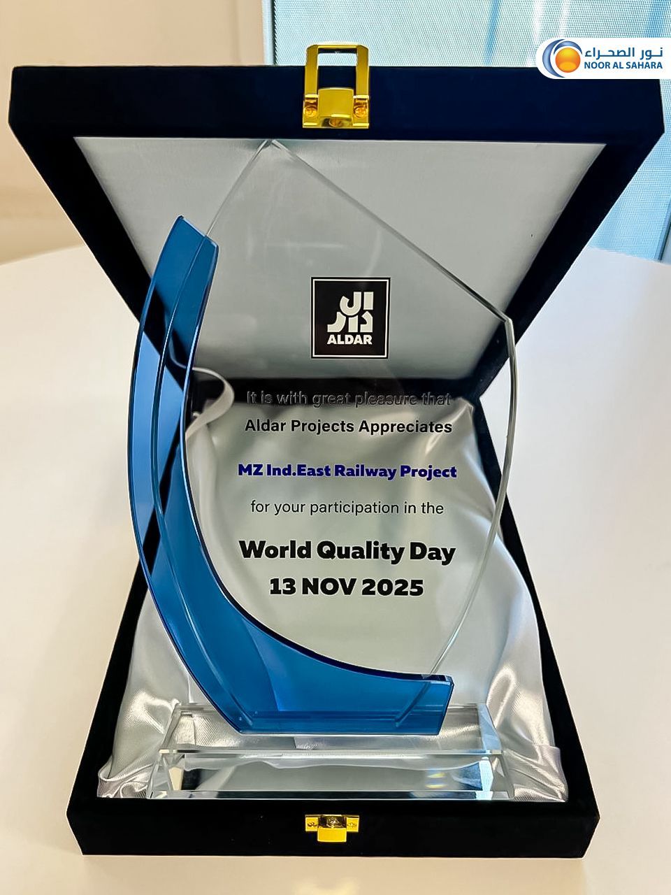 Noor Al Sahara General Contracting Sole Proprietorship (NAS) is proud to commemorate World Quality Day with a significant achievement: receiving a distinguished Trophy of Recognition from ALDAR. World Quality Day, observed annually on the second Thursday of November, is dedicated to honouring organizations that exemplify an unwavering commitment to quality and excellence. NAS is honoured to be counted among these leading organizations.